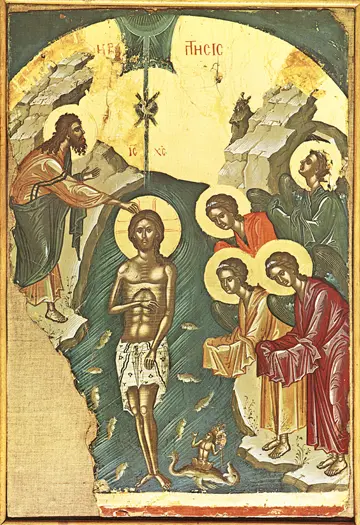 O ícone da Festa da Epifania narra a história dos Evangelhos em imagens e cores. No lado esquerdo do ícone, vemos João Batista vestido com pelos de camelo e com a aparência de alguém que vive no deserto. Seus braços estão estendidos, demonstrando uma atitude de oração e reverência, mas também direcionando outros a Cristo. Com a mão direita, ele realiza o batismo.